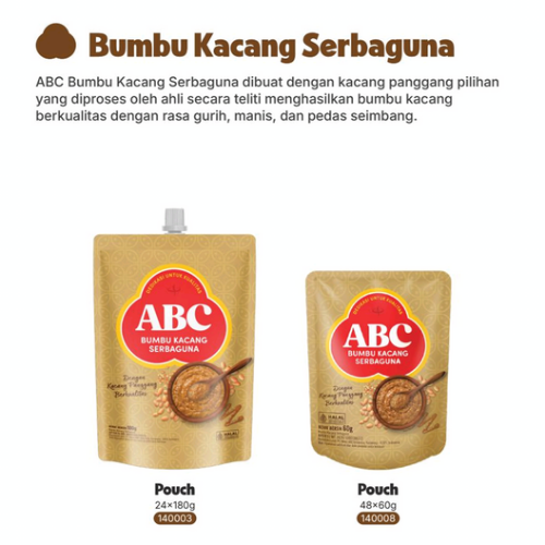 ABC Bumbu Kacang Serbaguna dibuat dari kacang panggang pilihan yang diolah secara teliti oleh ahlinya untuk menghasilkan rasa gurih, manis, dan pedas yang seimbang. Praktis digunakan untuk berbagai hidangan seperti sate, gado-gado, siomay, hingga aneka masakan khas Indonesia.