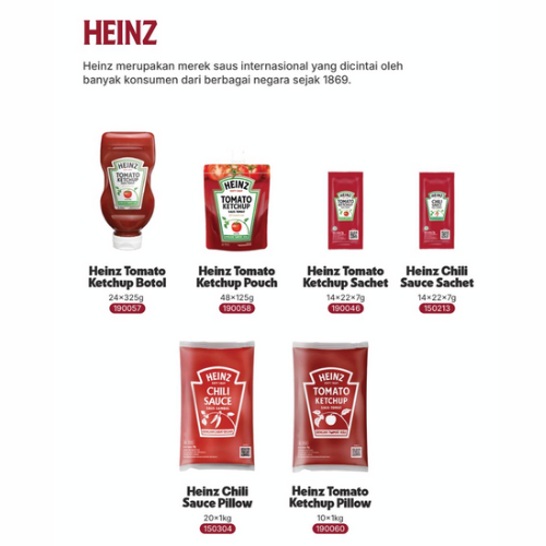 Heinz adalah merek saus internasional yang telah dipercaya sejak 1869 dan dicintai oleh konsumen di seluruh dunia. Hadir dengan kualitas rasa autentik dari tomat asli dan cabai segar, Heinz menjadi pilihan tepat untuk rumah tangga maupun bisnis kuliner.