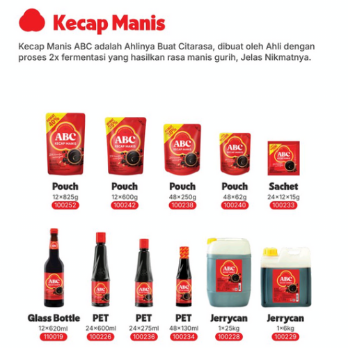Kecap Manis ABC adalah pilihan tepat untuk menghadirkan cita rasa manis gurih dalam setiap masakan. Dibuat dengan proses 2x fermentasi oleh ahlinya, menghasilkan kualitas rasa yang konsisten, nikmat, dan terpercaya.